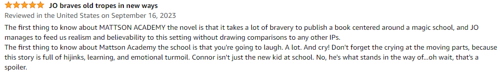 Mattson Academy has been out for over two months now, and I’ve managed to get a solid number of reviews. What’s even better is that not all of those reviews have come from friends and family! This is not to discount the love and support I’ve gotten from said friends and family, but it has been so exciting to see the response from readers I’ve never met before and to hear that they’ve also enjoyed the book. It’s also been really cool to see what exactly folks have liked about the book. I know what I like about it; of everything I’ve ever written, Mattson Academy is very much an instance of me writing the book I would want to read. Seeing that other people have also liked those things, or that they’ve liked completely different things, has blown me away. Therefore, I thought it would be fun to take a look at a few of those reviews and break ‘em down (and also again say thank you to all the people taking the time to write them).