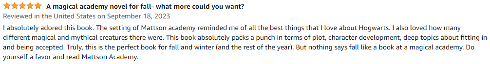 They said the book is perfect for the fall, and I’m glad because it was a pretty targeted decision to release it in the fall. We follow the characters through their first year at school, and I thought releasing it at the start of the school year would be perfect. That or at the end of the school year when the climax takes place, but this wasn’t the only reader to comment on the fall vibes so I guess we made the right choice. Thanks so much for the review!